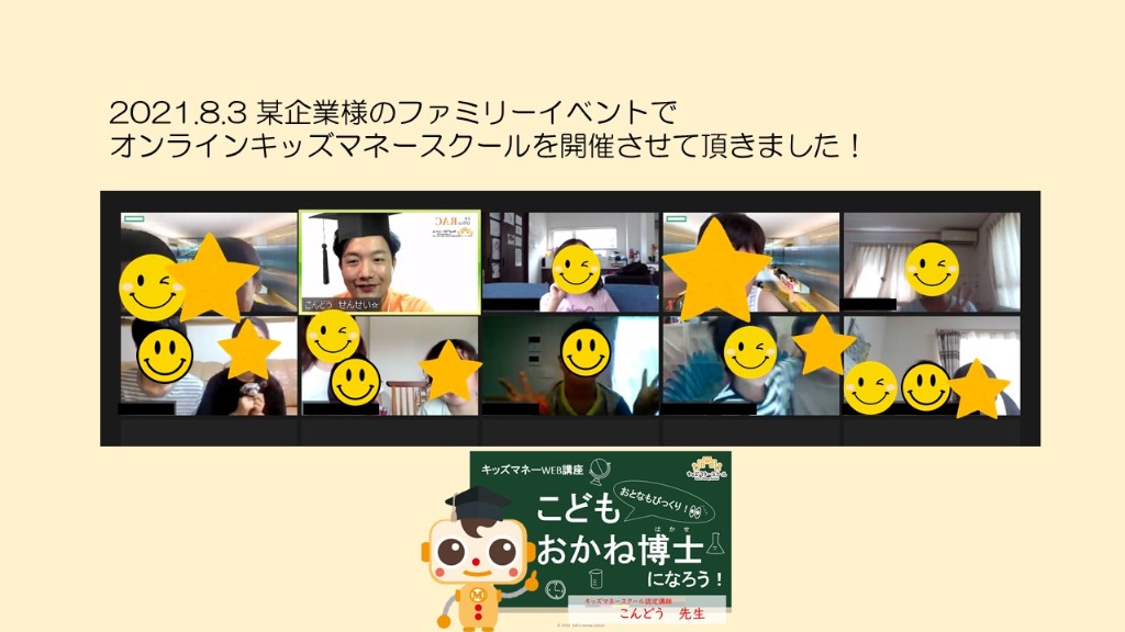 こんにちは。名古屋市昭和区の家計相談・子育て応援FPの近藤です。本日はオンラインでキッズマネースクールを開催。コロナでも安心の学びを提供します。8月3日AM某企業様のオンラインファミリーイベントで依頼を頂き1か月の準備を経ていよいよ本番今まで自主開催をメインにしてきた中で、企業様から価値を感じて頂き依頼を頂けたことがうれしいです。きっとコロナになってからオンラインでのマネースクール開催は僕がダントツで多いと自負しています。だからこそ、絶対満足いく内容を作りたいとスライドの見直し、話し方、笑いを取るところも含めて見直しをしました。準備で全てが決まります。本当にそうですね。個人的には今までで一番いい内容にできたと思います。参加頂けた方も非常に楽しんでいただき親子で学びの時間を共有できたようです。本日をきっかけにお金への考えが少しでも変わったらいいな~と考えています。オンラインのキッズマネーもオンラインの家計相談・保険相談・資産運用・ライフプラン全ていかにワクワク考えるかをテーマにしています。近藤のオンライン!エンターテイメントですよ!ぜひ体感ください。